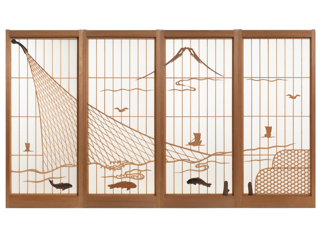 View the Fuji FusumaA luminous maritime tableau combining wood, kumiko joinery, and glass.
