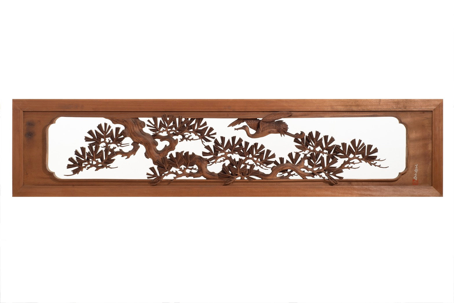 A rare, perfectly matched pair of antique Japanese ranma featuring sweeping pine boughs and a soaring crane: symbols of longevity, endurance, and blessing.